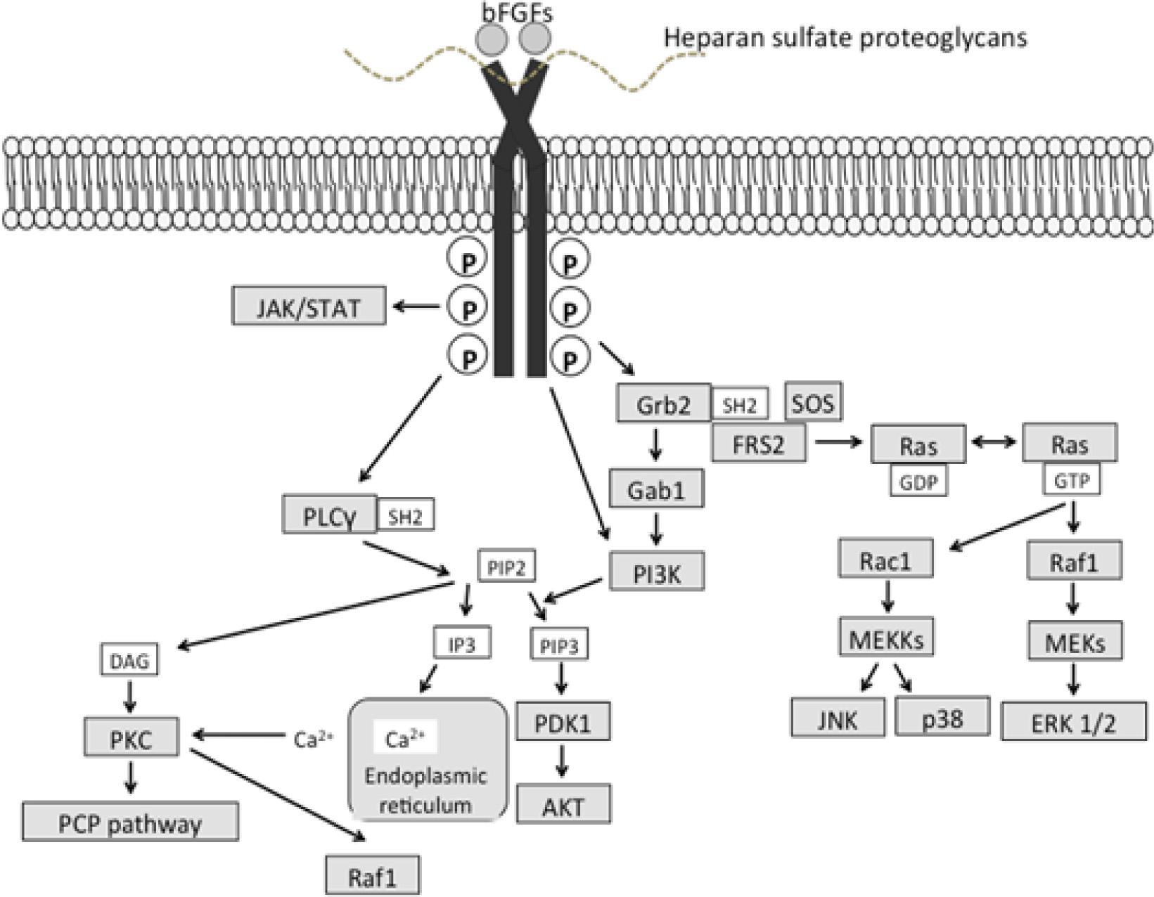 bFGF is a b-sheet protein that consists of 140 amino acids [21]. It contains two receptor binding sites, locating at residues 13–30 and 106–129 [22-24]. These residues bind to fibroblast growth factor receptors (FGFRs) on the cell surface [25]. FGFRs consist of four subtypes: FGFR1, FGFR2, FGFR3, and FGFR4 [26, 27]. The preferential binding ability of bFGF to its receptors may lead to a differential cell response [25]. The levels and types of receptor expression are crucial factors regulating bFGF signaling. FGFR expression levels are altered during cell proliferation or differentiation. For example, actively proliferating cells express higher FGFR than the confluent cells, implying an influence of bFGF on cell proliferation [28]. Moreover, FGFR levels are shown to increase or decrease during cell differentiation depending on cell type [29, 30]. The binding of bFGF to its receptors results in the activation of tyrosine kinase [31] and, subsequently, leads to initiation of various intracellular signaling, including phospholipase C (PLC)-g, protein kinase C (PKC), Ras (small GTPase)-mitogen-activated protein kinase (MAPK), phosphatidylinositol-4,5-bisphosphate 3-kinase (PI-3 kinase)/protein kinase B (AKT), signal transducer and activator of transcription-1 (STAT1)/ cyclin-dependent kinase inhibitor (p21), Src homology (Shc), and Src pathways [32, 33]. Further, bFGF can bind heparin and bFGF signaling can be enhanced in the presence of heparin sulfate proteoglycan [25, 34]. Heparin sulphate promotes the stability of receptor dimerization and prevents aggregation of bFGF [25, 34, 35]. A diagram summarizing the intracellular signaling induced by bFGF is shown as Figure 1.