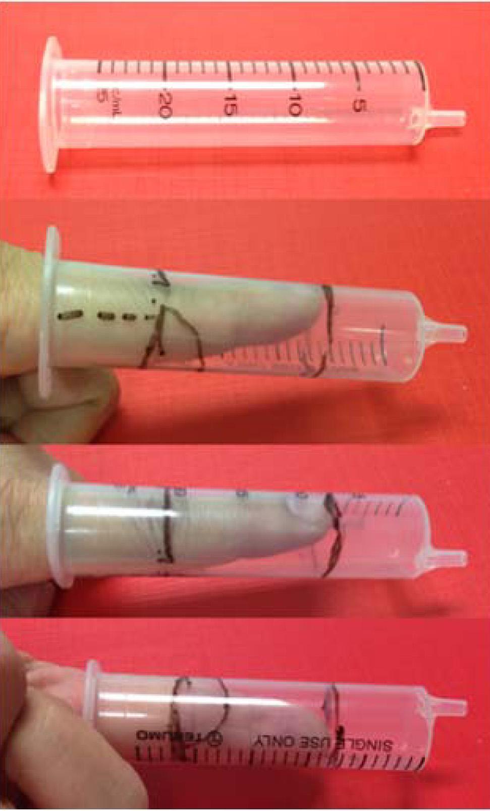 A 20 mL polypropylene syringe was cut in a transverse fashion at the dorsal part and wedge volar part at the level of the PIPJ preserving a 5-mm hinge on both radial and ulnar sides.