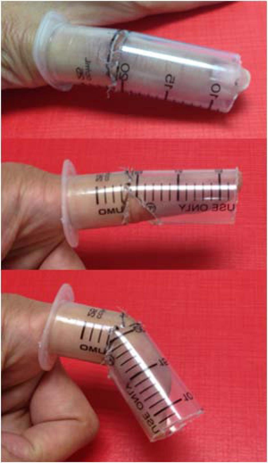 The frames were constructed from 20 mL polypropylene syringe barrels. The barrels were cut in a transverse fashion at the dorsal part and at the wedge volar part at the level of the PIPJ that preserves a 5-mm hinge on the radial and ulnar sides. The hinges allow some flexion motion of the finger. In case of a larger size or swollen finger, a longitudinal split at the proximal part of a syringe may be enlarged. Wrapping the longitudinal cut with a tape will make it stronger. Patients were followed once a week to ensure the proper use of the frame and motion exercises of the fingers.