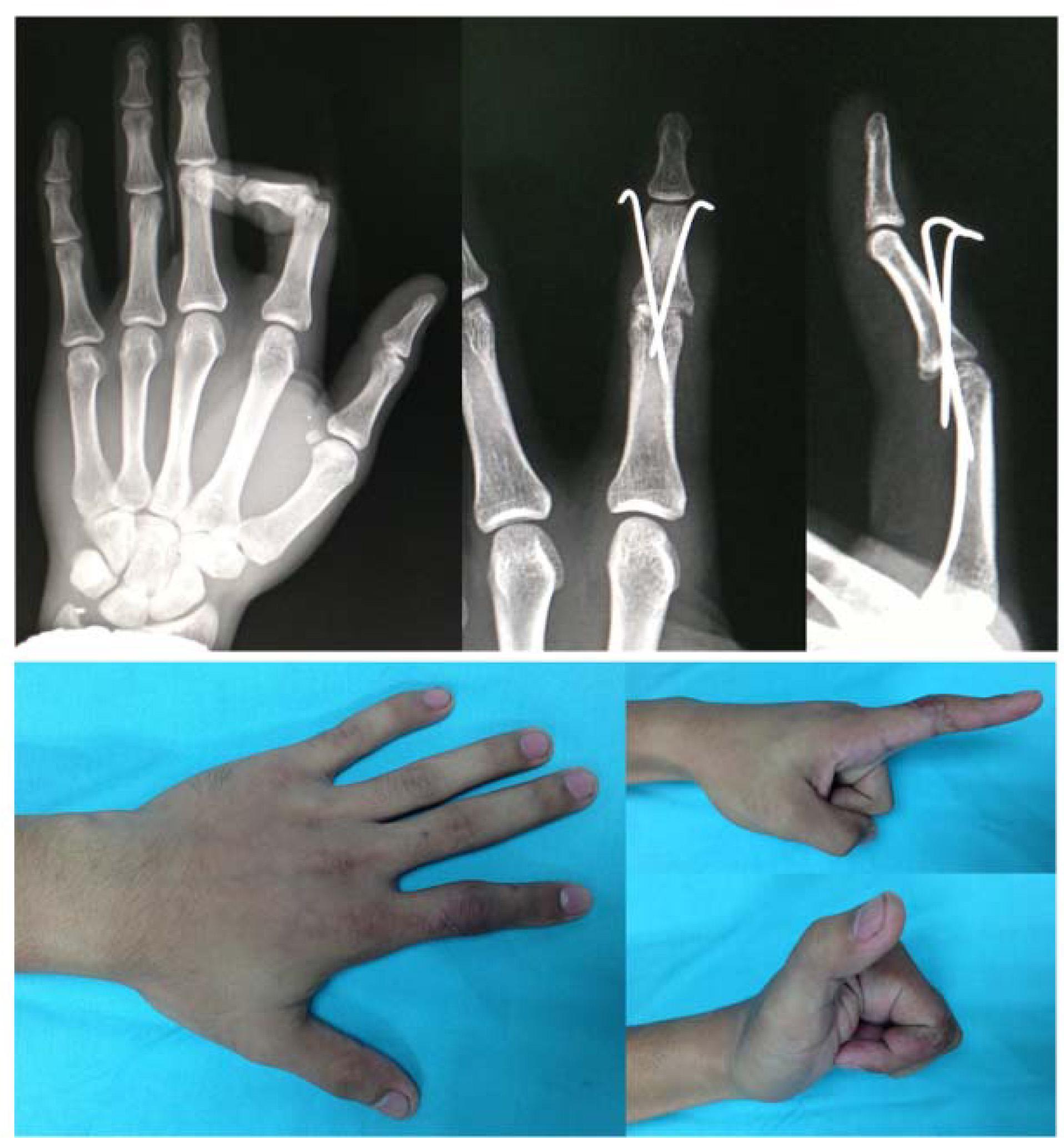 | Initial treatment | Direct repair of radial collateral ligament and K-wire fixation | Repair of radial collateral ligament, central slip and K-wire fixation |