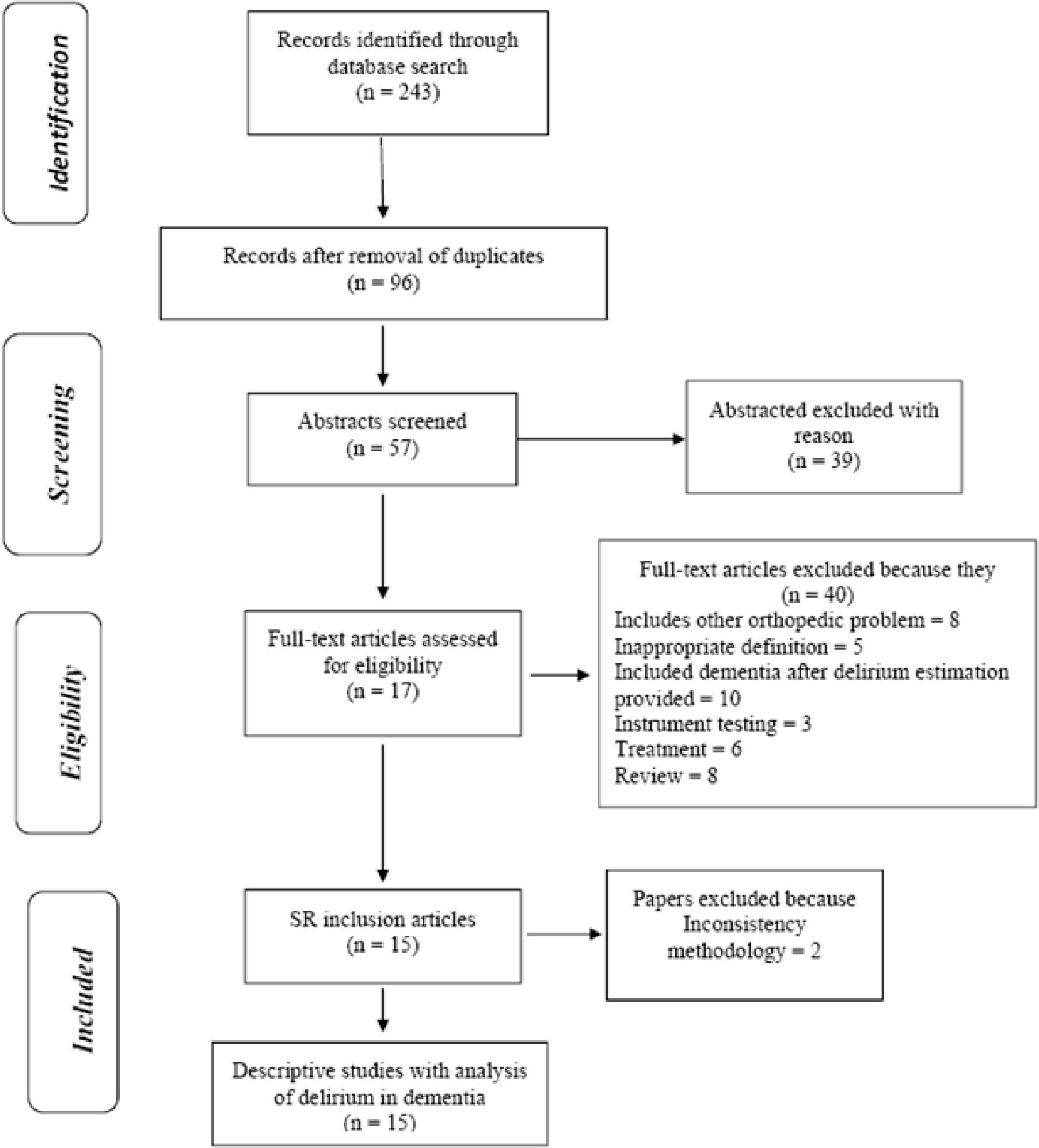 Our key study questions were devised using the PICO acronym (patient, intervention or exposure, comparator, and outcome). They met the following criteria: (a) elderly patients (aged 65 years or over) with hip fracture; subgroups included those with delirium and/or those with dementia (e.g., dementia, Alzheimer disease). Elderly patients were considered as living with dementia if their average Informant Questionnaire on Cognitive Decline in the Elderly (IQCODE) score was ≥3.6, IQCODE-SF (short form) score ≥3.44, Blessed Dementia Scale score ≥4, Mini– Mental State Examination (MMSE) score ≤24 (b) intervention or exposure: DSD, (c) comparator: delirium, and (d) outcome: outcomes related to psychomotor subtypes, duration and/or severity, length of hospital stay, physical and/or cognitive recovery, mortality as shown in Table 1. The main research question was therefore, what are the psychomotor subtypes for delirium with and without dementia in elderly patients with hip fracture?