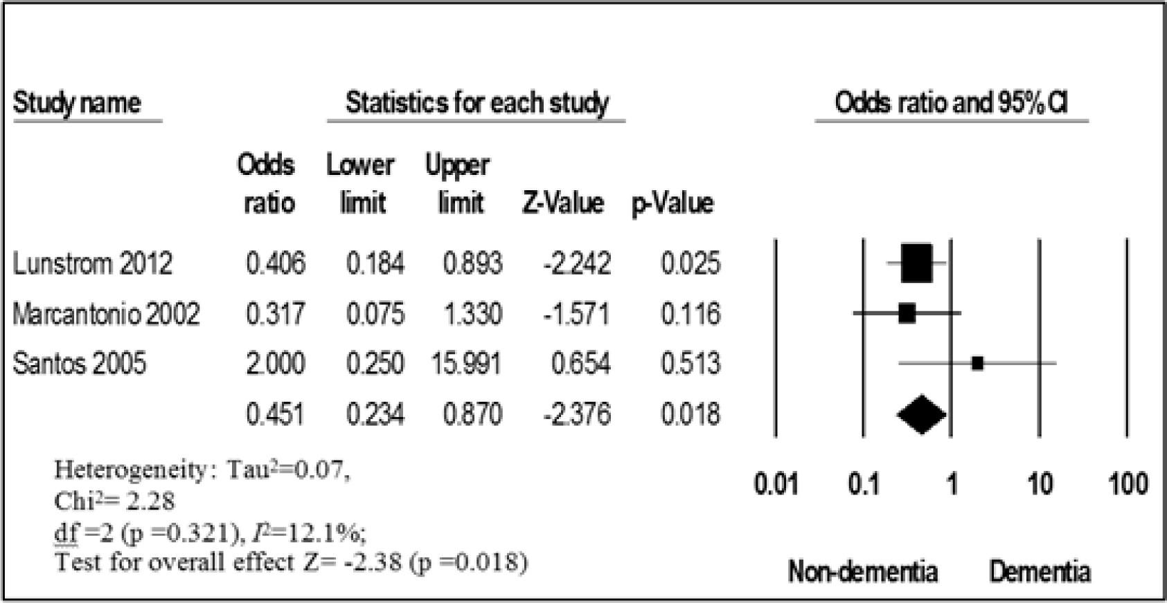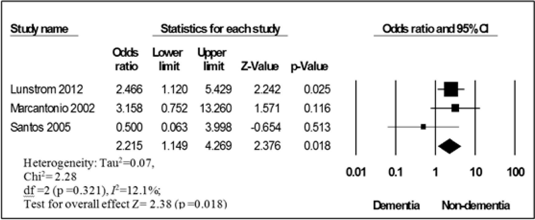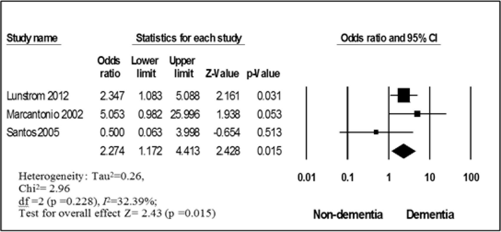 To assess the psychomotor types in patients with and without dementia, we compared the difference of pure hypoactive delirium and any hyperactive delirium between those groups (Table 3). The review found that the motor subtype in the participants with dementia was often characterized by significantly greater hyperactive delirium (ES = 2.27, 95% CI = 1.72-4.41, P = 0.015) with nonsignificant heterogeneity (Figures 2 and 3). Participants without dementia were often characterized by hypoactive delirium (ES = 2.22, 95% CI = 1.15-4.27, P = 0.018) with nonsignificant heterogeneity as seen in Figures 4 and 5.