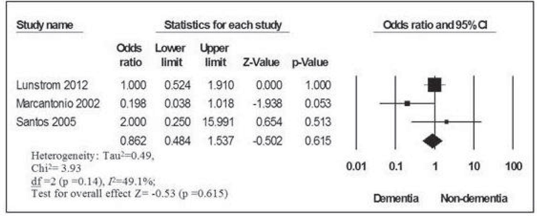 We considered 3 issues: the prevalence and/or incidence, motor subtypes and outcomes of delirium in hip fractures of older patients with dementia during hospitalization. We had a plan for analysis of each of these issues. We used Comprehensive Meta-Analysis software to combine the data across studies for meta-analysis [13]. A fixed-effects model was used initially in this systematic review because we found homogeneity across the study population. A random-effects model was applied only if statistical heterogeneity existed. We assessed statistical heterogeneity using a Cochran Q test and by calculating squared and I2 values (I2> 75% considered high level of heterogeneity) [19]. When heterogeneity was substantial (I2> 75%), we investigated the sources of heterogeneity by determining the effect of important modiûers: sample details (type and quantity), study design and risk for bias, and the effect of the imputed data.