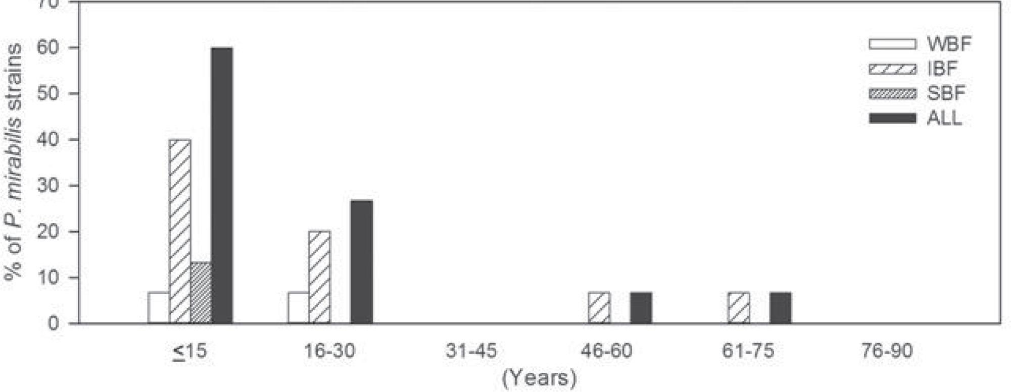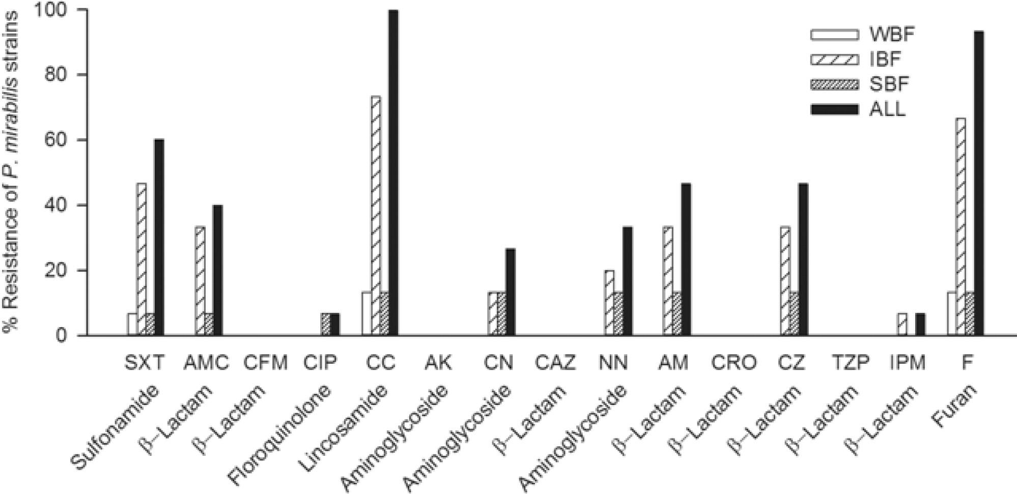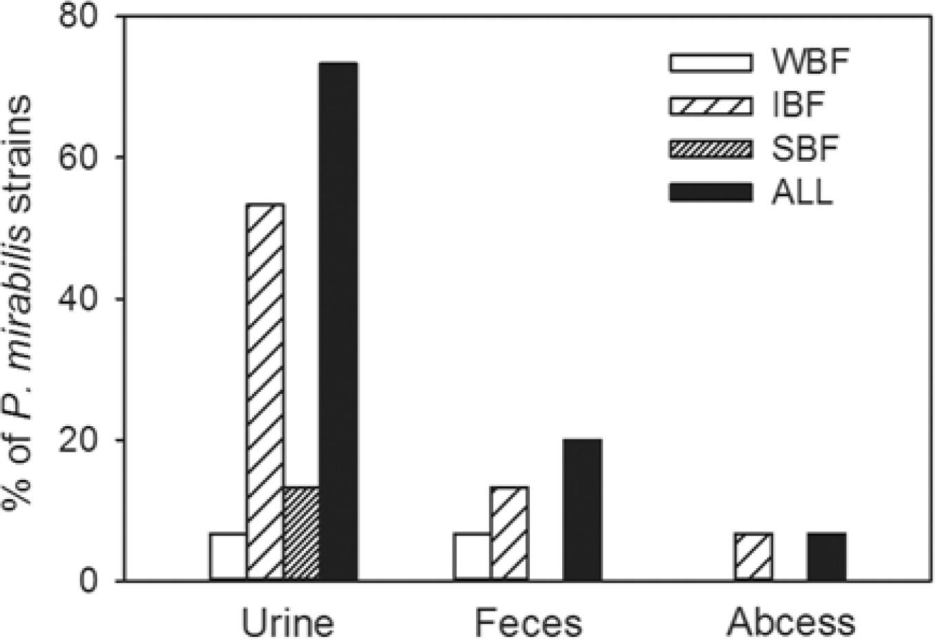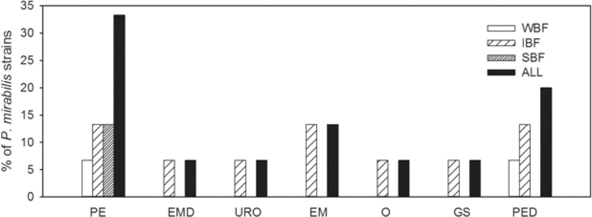 | WBF P. mirabilis strains (%) | IBF P. mirabilis strains (%) | SBF P. mirabilis strains (%) | |