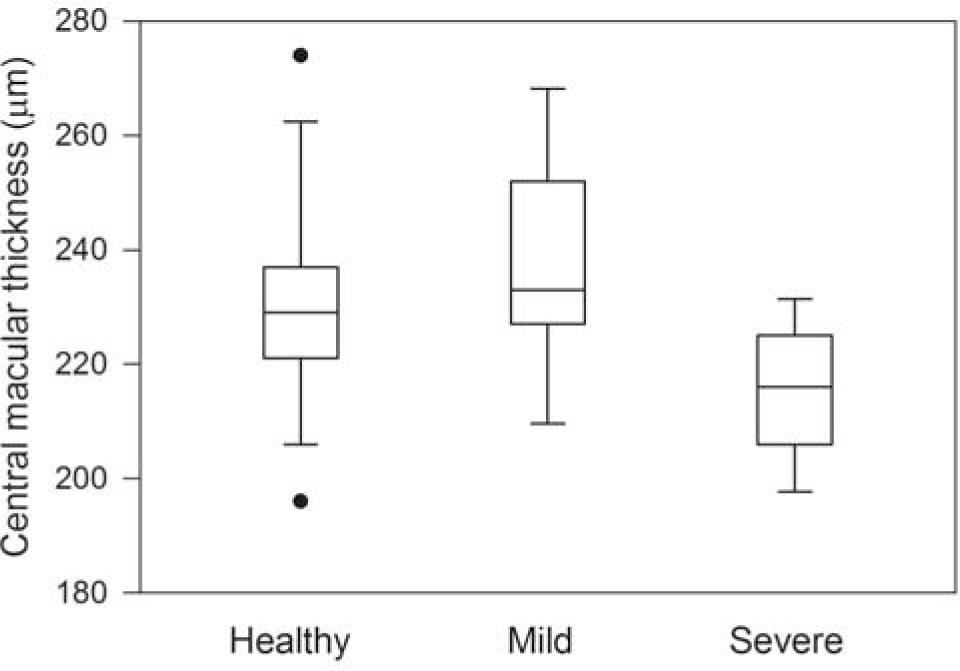 Boxplots showing the median (line) central macular thickness among healthy (healthy, n = 24), mildly traumatized (mild, n = 13), and severely traumatized (severe, n = 13) groups. Box boundaries indicate 25th and 75th percentiles and whiskers indicate 5th and 95th percentiles. Outliers are shown as solid circles.