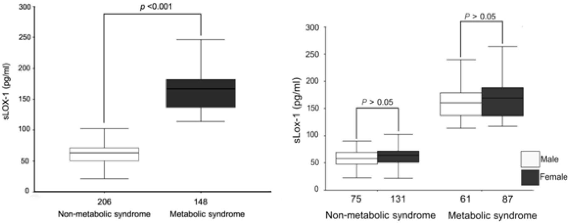 sLOX-1 (pg/mL) | 148 (100) | 206 (100) | 1.2 (1.1-1.4) | <0.001 P < 0.05 | ||