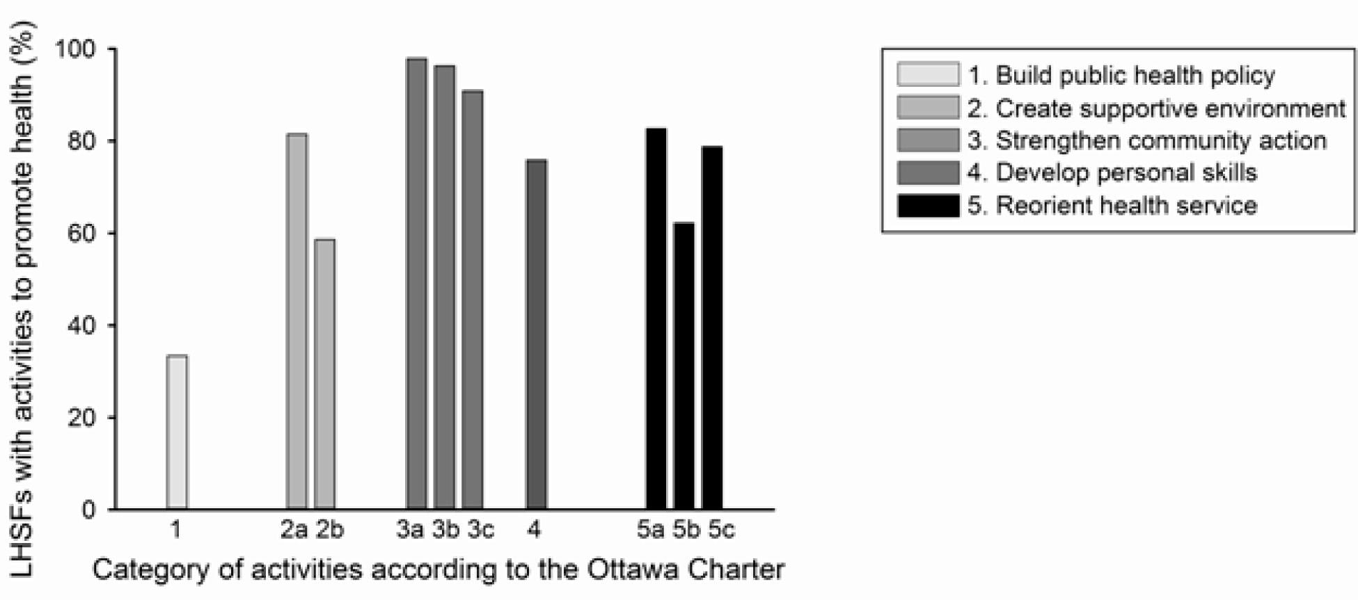 Percentage of LHSFs with activities according to the Ottawa Charter. 2a, Facility development, 2b. Creating community space. 3a, Community action plans. 3b, Community strengthening development 3c, Community networking. 5a, Type of activities. 5b, Methods of implementation. 5c, Integration health promotion activities into home visits.