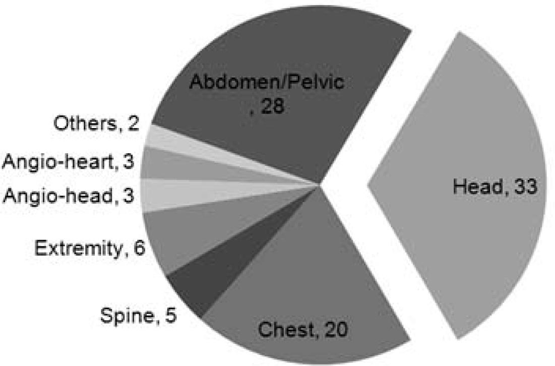 The frequency of the CT examinations performed is shown in Figure 1. Number, age and sex of patients were collected in Table 1. Availability and usage of shielding tools in five hospitals evaluated is also shown in Table 2.