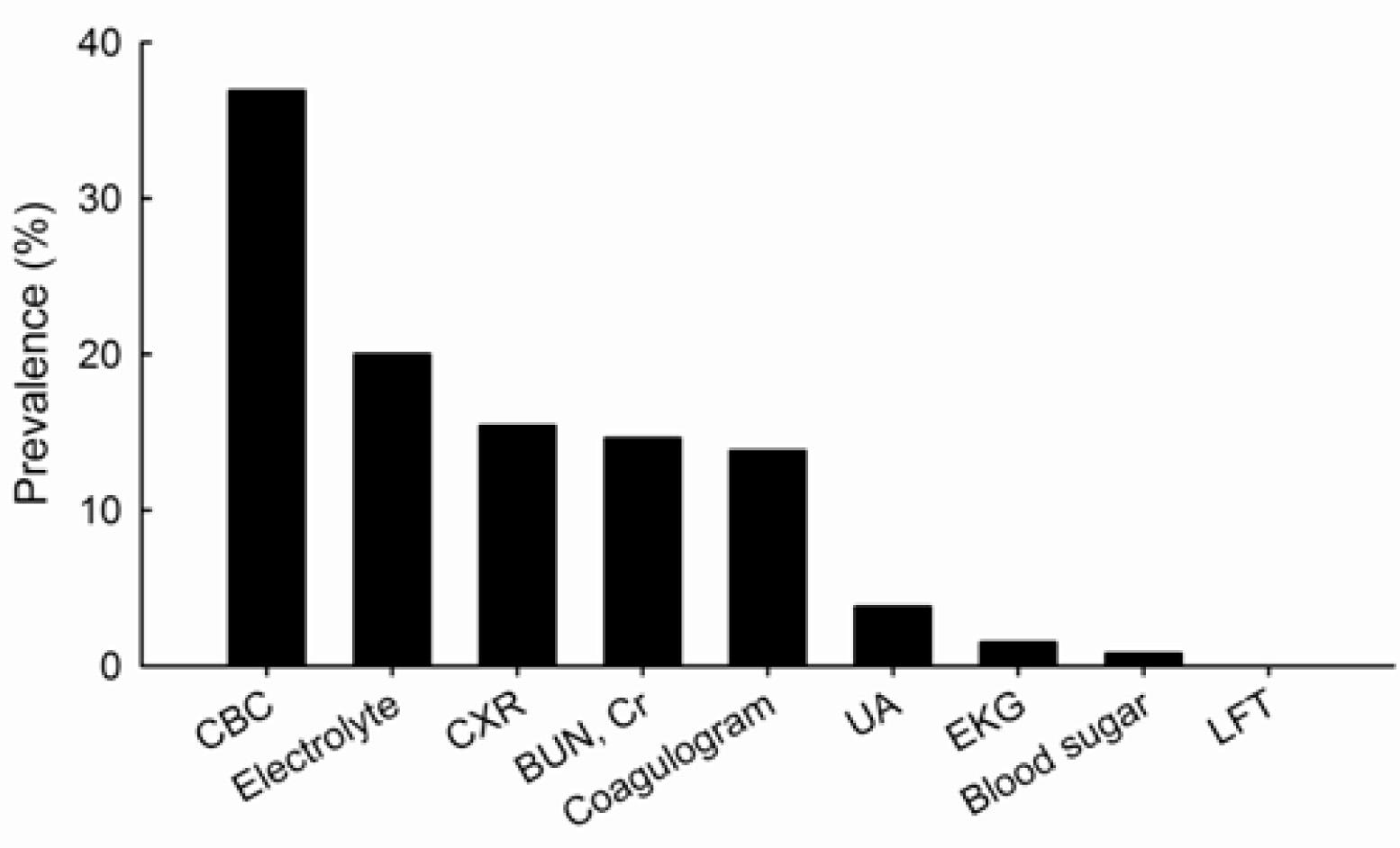 Prevalence of inappropriate preoperative laboratory investigations CBC = complete blood count, CXR = chest radiograph, BUN = blood urea nitrogen, Cr = creatinine, UA= urinalysis, EKG = electrocardiogram, BS = blood sugar, LFT = liver function tests