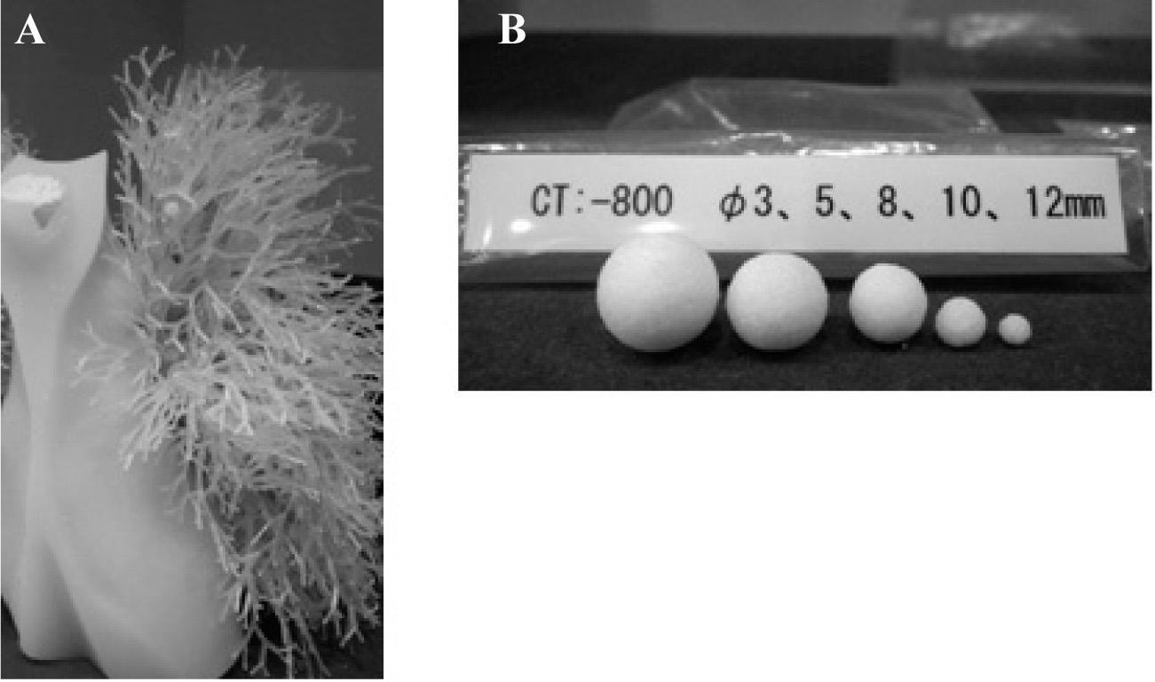 The inner components of the LUNGMAN phantom, B: Various sphere sizes of simulated lung nodules of 3, 5, 8, 10, and 12 mm in diameter