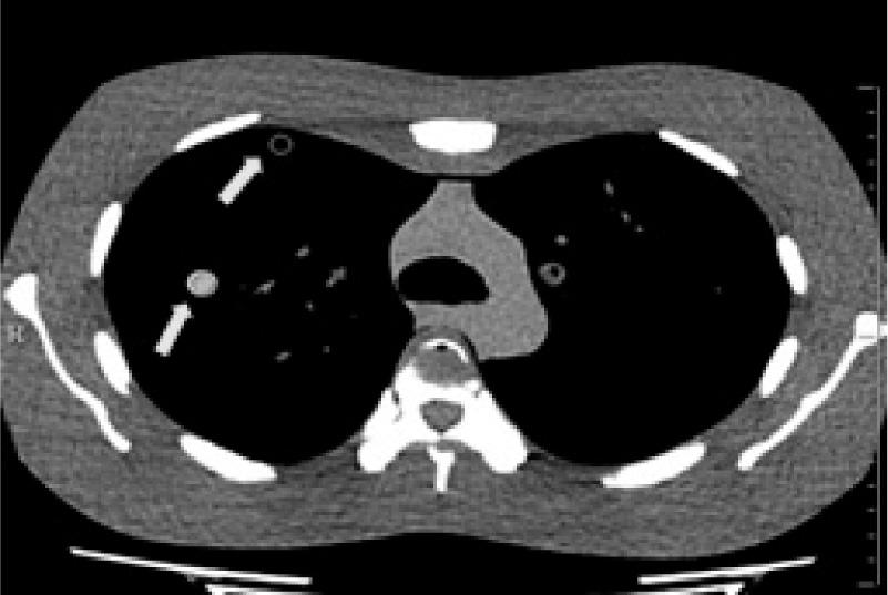 The contrast-to-noise ratio (CNR) was measured by placing the 2 circular regions of interests (ROIs) of similar areas within the nodule and background at the same slice to determine objective image quality (Figure 2). Each nodule was measured three times, and the size of ROI was approximately 90% of nodule’s boundary. The mean CT number and mean SD within the ROIs were recorded. The SD in the ROI of the background was used to define noise. The CNR is determined using the following formula: