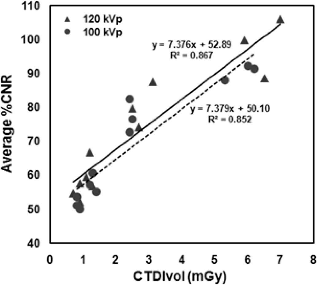 The CNRs calculated from different scanning parameters were then normalized at targeted SD 9, helical pitch 0.813 and 120 kVp in order to obtain the %CNR in each protocol. The %CNR using the following formula: