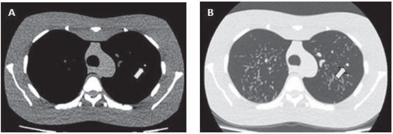Computed tomography chest images with 5 mm nodule in diameter (arrow) at target SD 20, 10–400 mA, pitch 0.813 and 120 kVp, and displayed with (A) soft tissue window, WL/WW setting of 60/360 Hounsfield Units (HU) and (B) lung window, WL/WW setting of –600/1600 HU