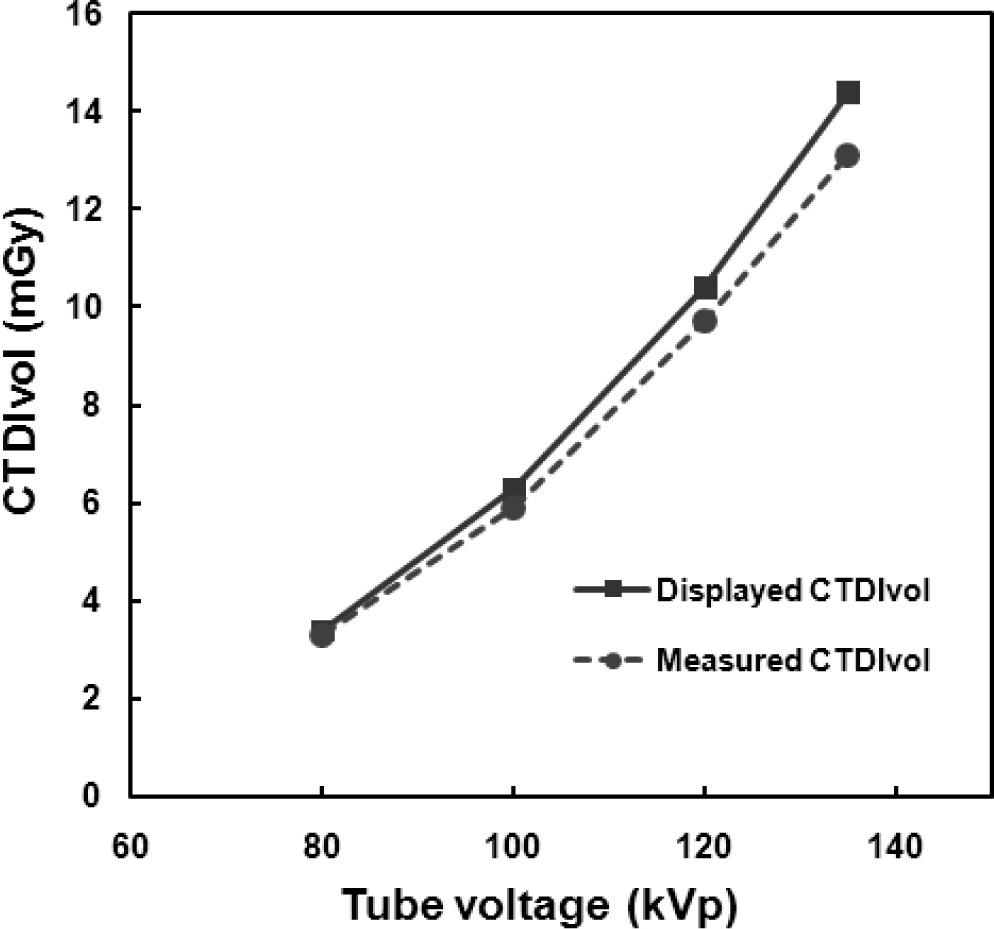 Plot of volume of computed tomography detector index (CTDIvol) displayed on the monitor (solid line) and measured CTDIvol (dash line) using body technique as a function of kVp for CTDIvol verification of less than 10% discrepancy
