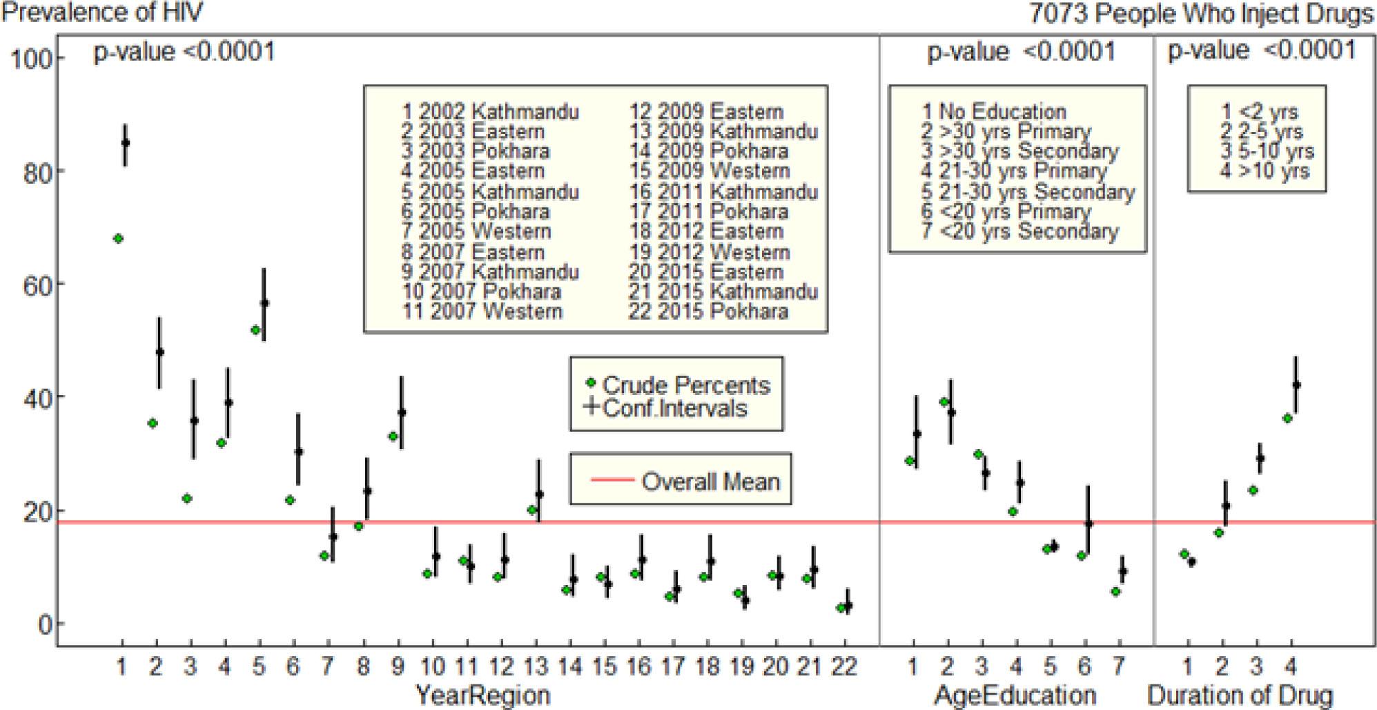In the logistic regression, year-region factor, age group-education factor, and duration of injecting drugs were significantly associated with HIV infection. The graph below shows results from fitting logistic model for HIV infection prevalence, with year-region factor, age group-education factor, and duration of injecting drugs as determinants. The model also highlights a substantial decrease on HIV infection prevalence from 2002 to 2015. Kathmandu Region had highest prevalence compared to other regions of Nepal. HIV infection prevalence increases with age. The prevalence was highest for those aged ≥30 years. Education was significantly associated with HIV infection as the highest prevalence was observed among the illiterate in all age groups. Moreover, the prevalence significantly increased with duration of injecting drugs. Higher prevalence was found among PWID who had a duration of injecting drugs >10 years.