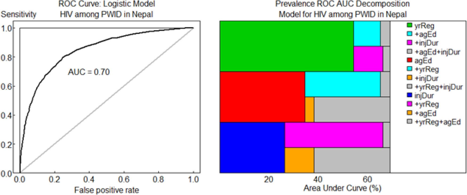 ROC curve: logistic model for HIV infection among People Who Inject Drugs in Nepal. Key: yrReg is year-region factor, agEd is age-education factor, and injDur is duration of injected drug use