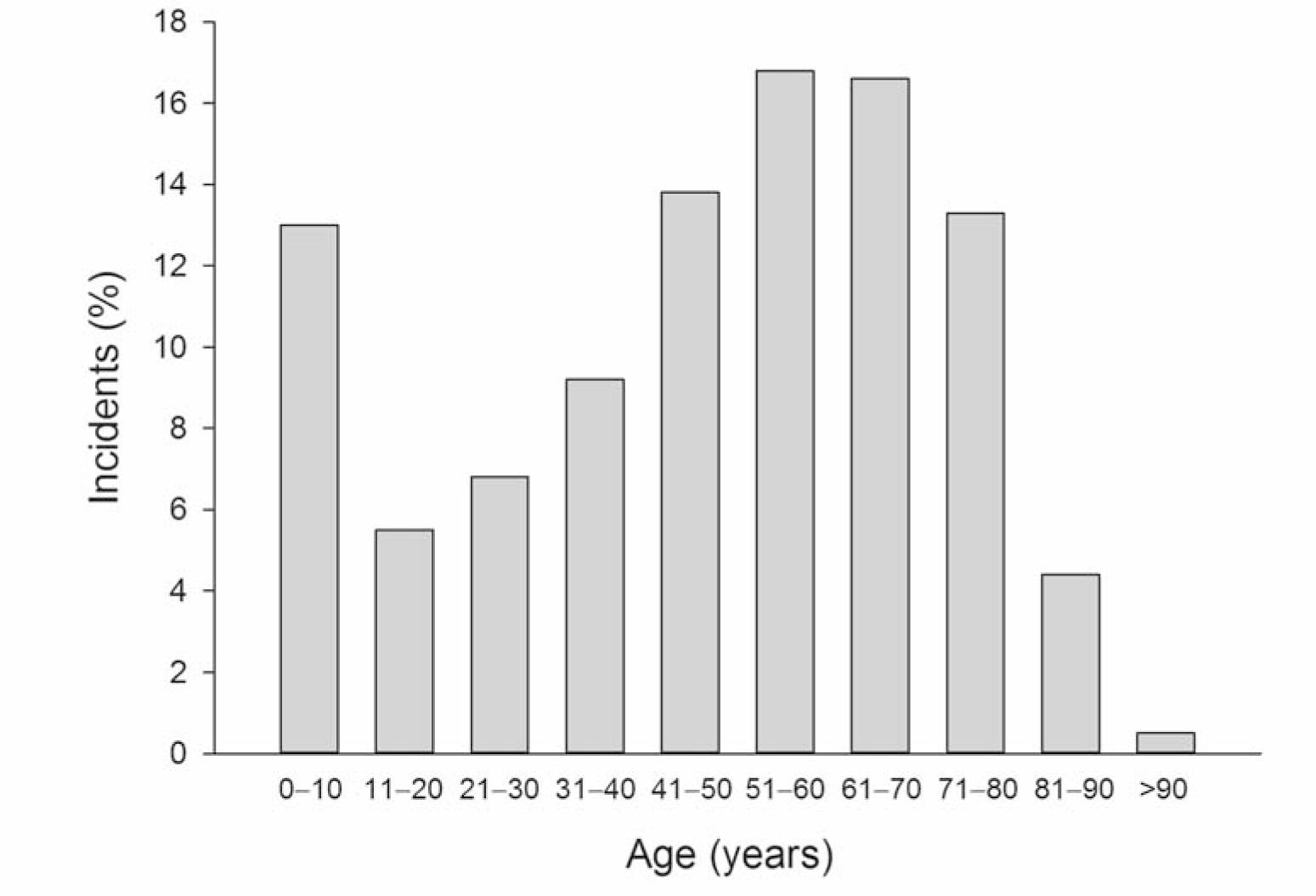 After screening by the site manager of each hospital and the project manager (SC), 2,206 incident report forms with 3,028 critical incidents were sent to the data management unit. The 22 public hospitals representing all regions of Thailand were recruited as the PAAd Thai study participants [7]. The age of patients reported varied from 1 day to 97 years with a male:female sex ratio of 1,136:1,050 (52%:48%). Figures 1 and 2 respectively show the distribution of age and American Society of Anesthesiologists Physical Status (ASA PS) classification of patients in the PAAd Thai database.