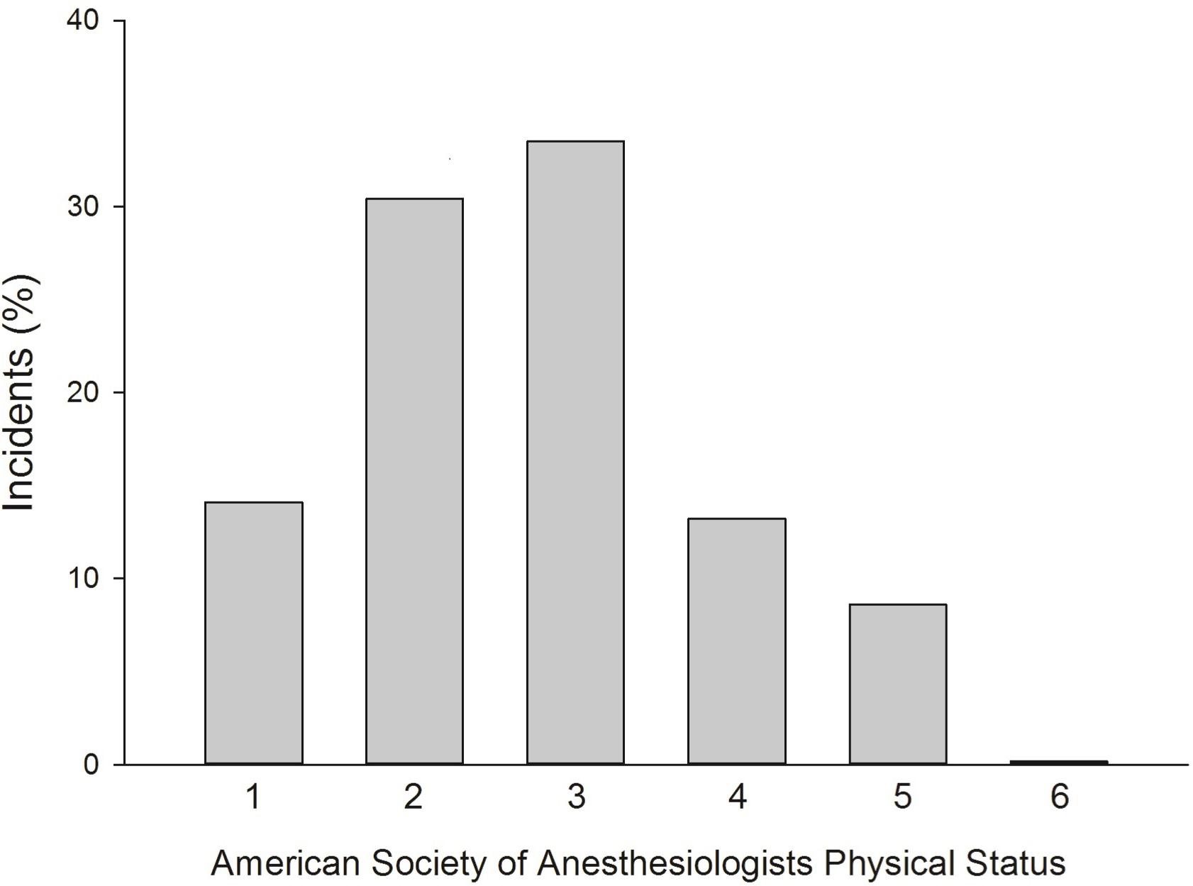Compared with the female:male sex ratio of 5.3:4.7 in the THAI Study that represented patients undergoing surgery in Thailand, the female:male sex ratio of patients in the PAAd Thai study was 4.8:5.2. The more frequent incidence of critical events that occurred in male patients was similar to that found in previous studies [6]. The proportion of patients in the PAAd Thai study was consistent with the Thai AIMS because both studies were confined exclusively to patients who experienced critical incidents. More than half of incident reports occurred in ASA PS groups 3, 4, and 5. However, critical incidents also occurred in patients with normal or mild systemic diseases (ASA PS of 1 and 2) comprising 44.5% (Figure 2). Therefore, attending anesthesia personnel should remain vigilant for adverse events in patients receiving surgery with no underlying disease.