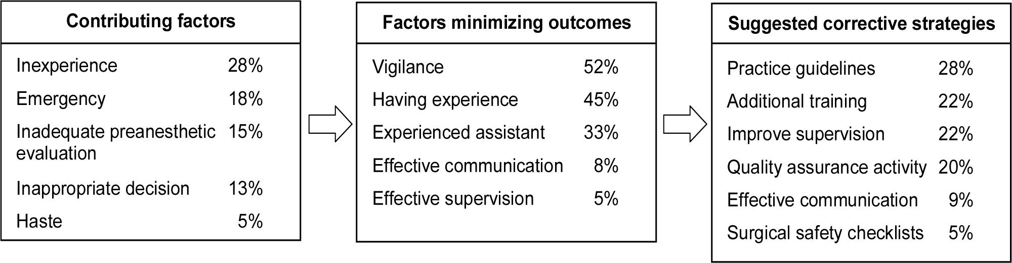The common contributing factors for critical incidents were inexperience, emergency conditions, inadequate preanesthetic evaluation and preparation, and inappropriate decision making. By contrast, the factors minimizing incidents were vigilance and advanced experience. Suggested corrective strategies are improvement in compliance with practice guidelines, quality assurance activity, continuing education, and improvement of supervision.