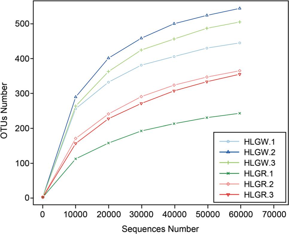Rarefaction curves of six pitaya samples. OTUs are shown at the 97% similarity.