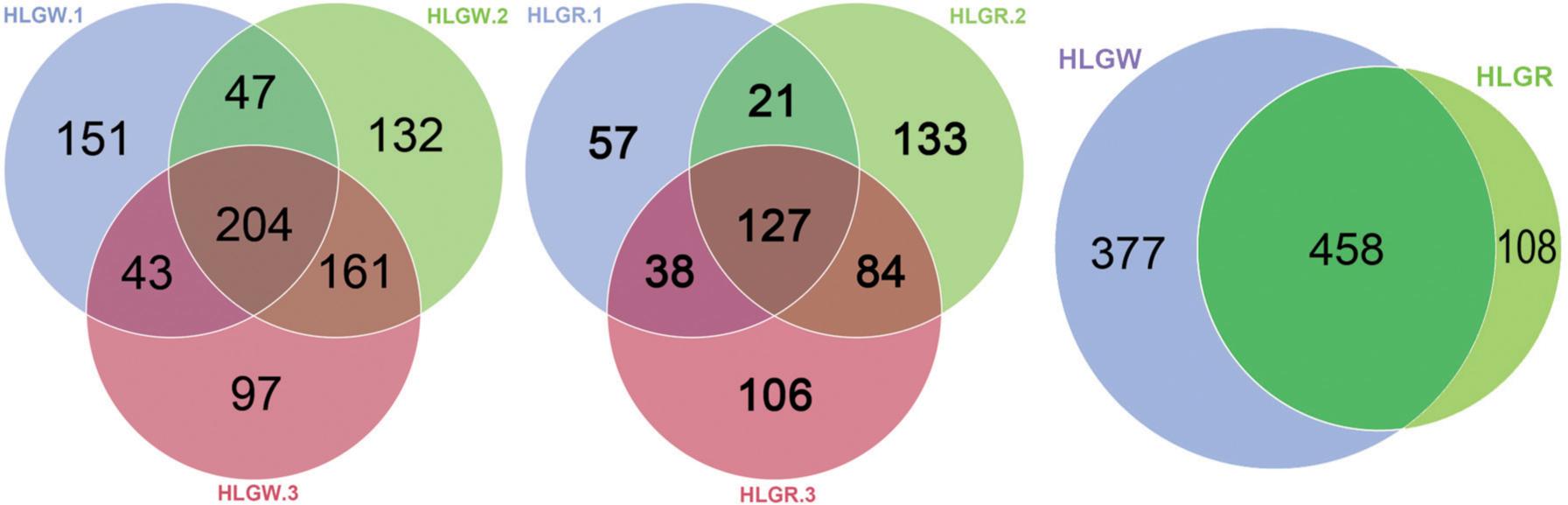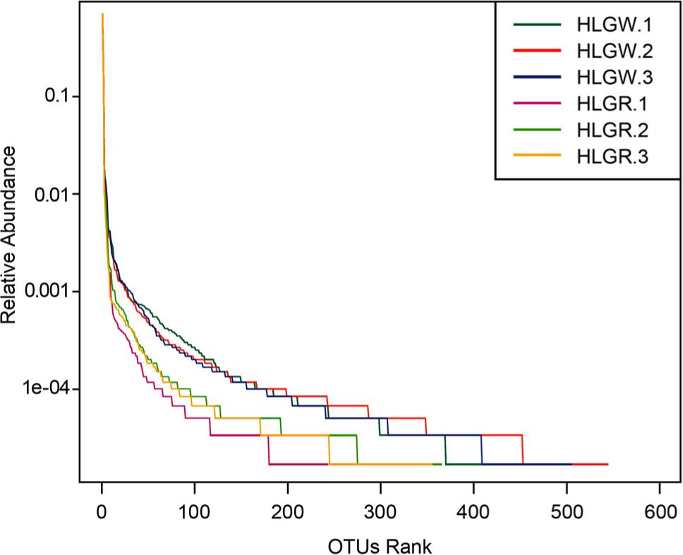 Alpha diversity analysis. Alpha diversity indices were calculated to analyze bacterial richness and diversity within communities (Table III). All of the alpha indices of white pitaya group (HLGW) were higher than in red pitaya group (HLGR). Rarefaction analysis was carried out to determine the sequence coverage of six samples (Fig. 1). All of the rarefaction curves are almost approaching their asymptotes indicated the sequence amount is adequate. Rank abundance curves indicated the species richness and species evenness of each sample were different (Fig. 2). Venn graphs were constructed to show the number of shared and unique OTUs in different groups (Fig. 3). Each sample contained a certain number of unique OTUs and white pitaya group contained much more unique OTUs than the red pitaya group.