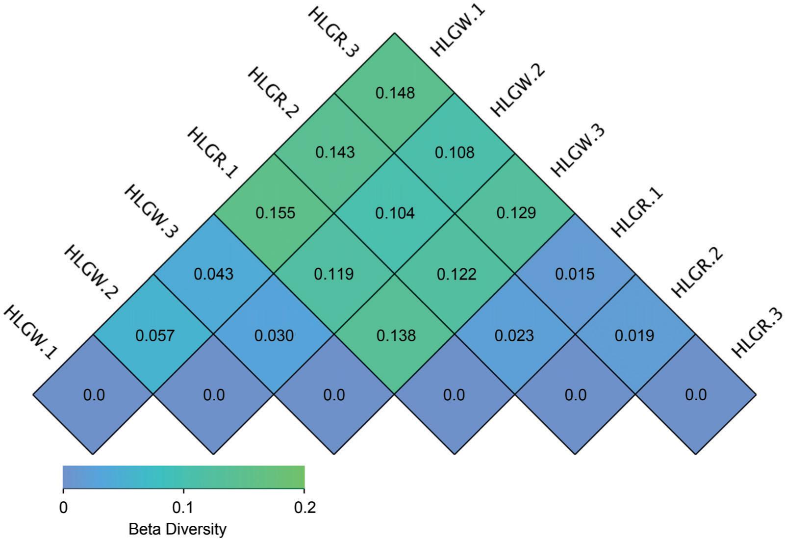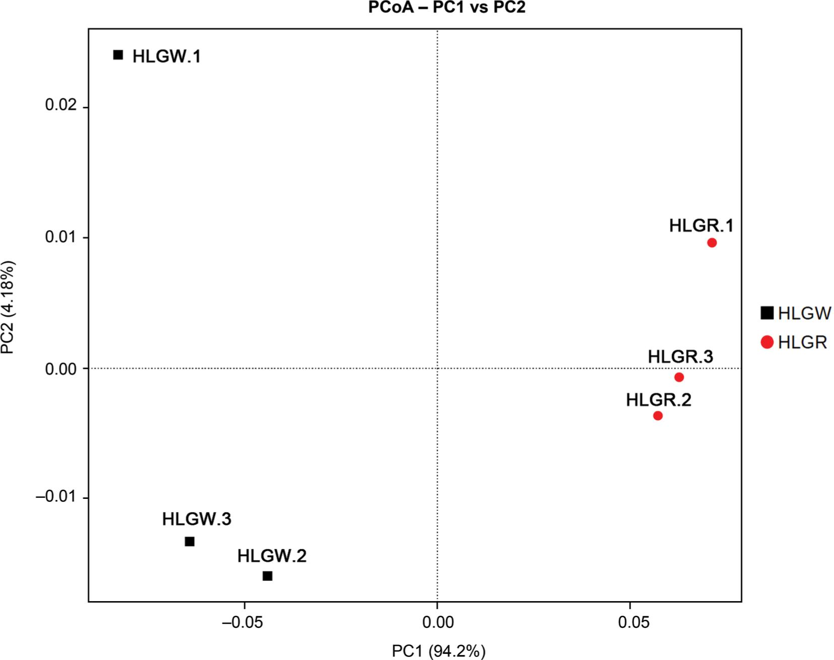 Beta diversity analysis. A heatmap of Beta diversity index was constructed (Fig. 4). Principal component analysis (PCA), principal coordinate analysis (PCoA), non-Metric multi-dimensional scaling (NMDS) and unweighted pair-group method with arithmetic mean (UPGMA) were carried out to evaluate differences of samples in species complexity (Fig. 5–8). As a result, all analysis showed that the microbial communities were different between white and red pitaya groups. Samples from white pitaya and red pitaya were clustered together respectively. The bacterial community structure of each sample in red pitaya group showed higher similarity.
