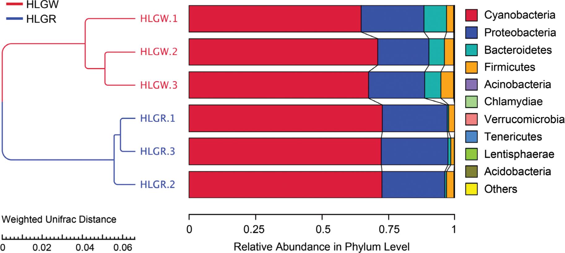 Statistical analysis. Paired-end reads obtained by sequencing were divided into six groups according to the unique barcode and truncated by cutting off the barcode and primer sequence. Paired-end reads were merged to generate raw tags (Magoc and Salzberg, 2011); quality filtering on the raw tags was performed to obtain the high-quality clean tags (Bokulich et al., 2013; Caporaso et al., 2010). Clean tags were compared with the reference database to detect and remove chimera sequences to generate effective Tags (Edgar et al., 2011; Haas et al., 2011). Sequences were analyzed by Uparse software and were assigned to the same OTUs with ≥ 97% similarity (Edgar, 2013). Representative sequence for each OTU was annotated by GreenGene database based on RDP classifier and multiple sequence alignment was performed by MUSCLE software (DeSantis et al., 2006; Edgar, 2004; Wang et al., 2007). Alpha diversity and beta diversity analysis, including chao1, shannon, simpson, ACE, good-coverage, rarefaction analysis, rank abundance analysis, principal component analysis (PCA), principal coordinate analysis (PCoA), unweighted pair-group method with arithmetic means (UPGMA), non-metric multi-dimensional scaling (NMDS) analysis and T-test analysis were performed by QIIME and displayed with R software (Caporaso et al., 2010).