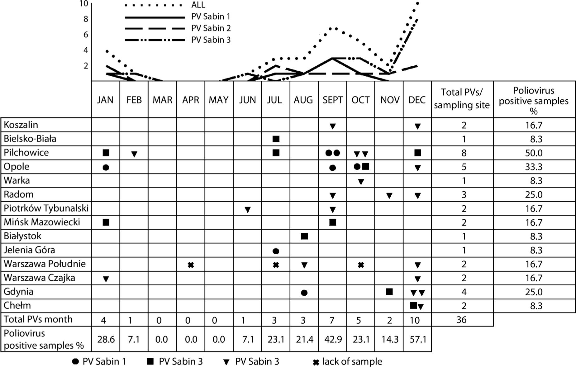 Most of identified PVs come from samples collected during the June-December period (Fig. 1). The most frequently identified PV type 3 was detected in the following months: January, February, June, August (7.1%), September (21.4%), October (23.1%) and November (7.1%) with a peak on December (57.1%). Detection of PVs type 2 was mainly observed from July to December. PVs type 1 were isolated almost on the same level as PVs type 2, without a clear peak. All samples collected in March, April and May were negative for polioviruses.