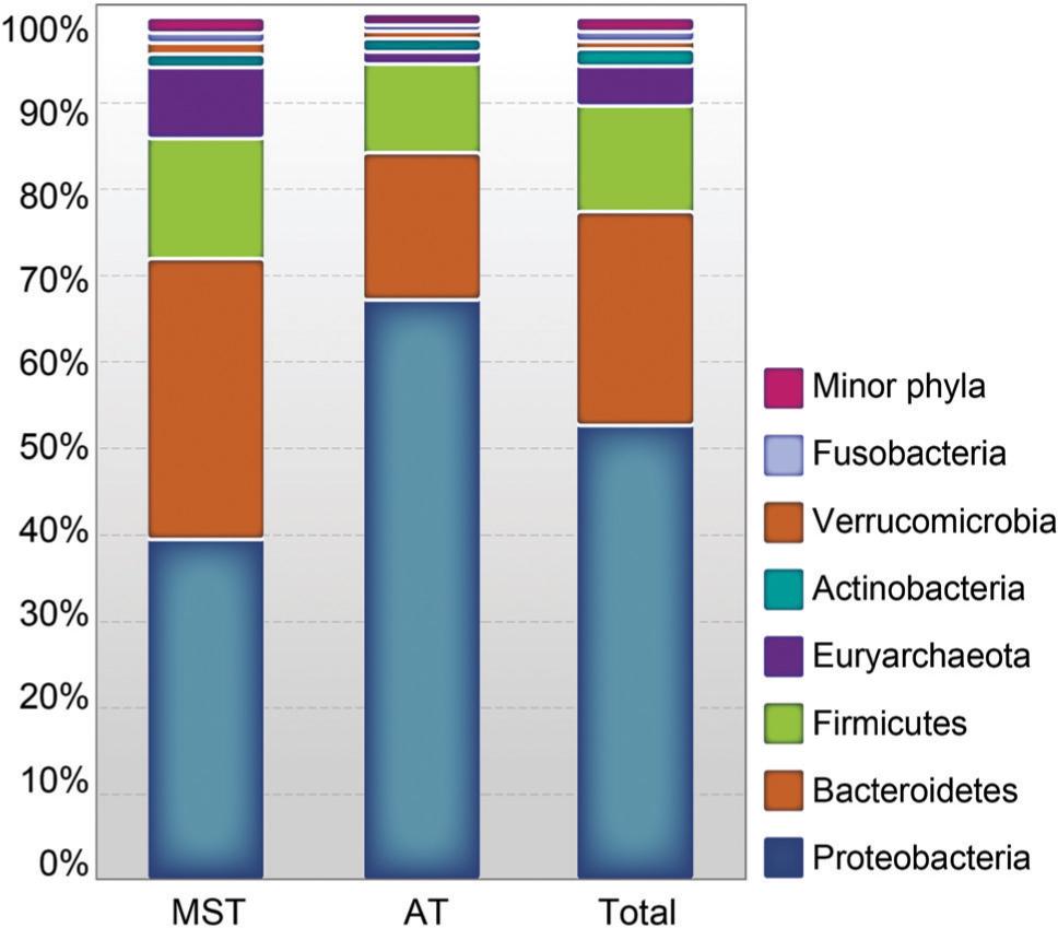 Proportions of phyla for each group.Phyla represented by < 1% of total sequences across all 2 groups were combined and regarded as minor phyla. “Total” is the proportion of total sequences across all 2 groups. MST, manure storage tank; AT, aeration tank