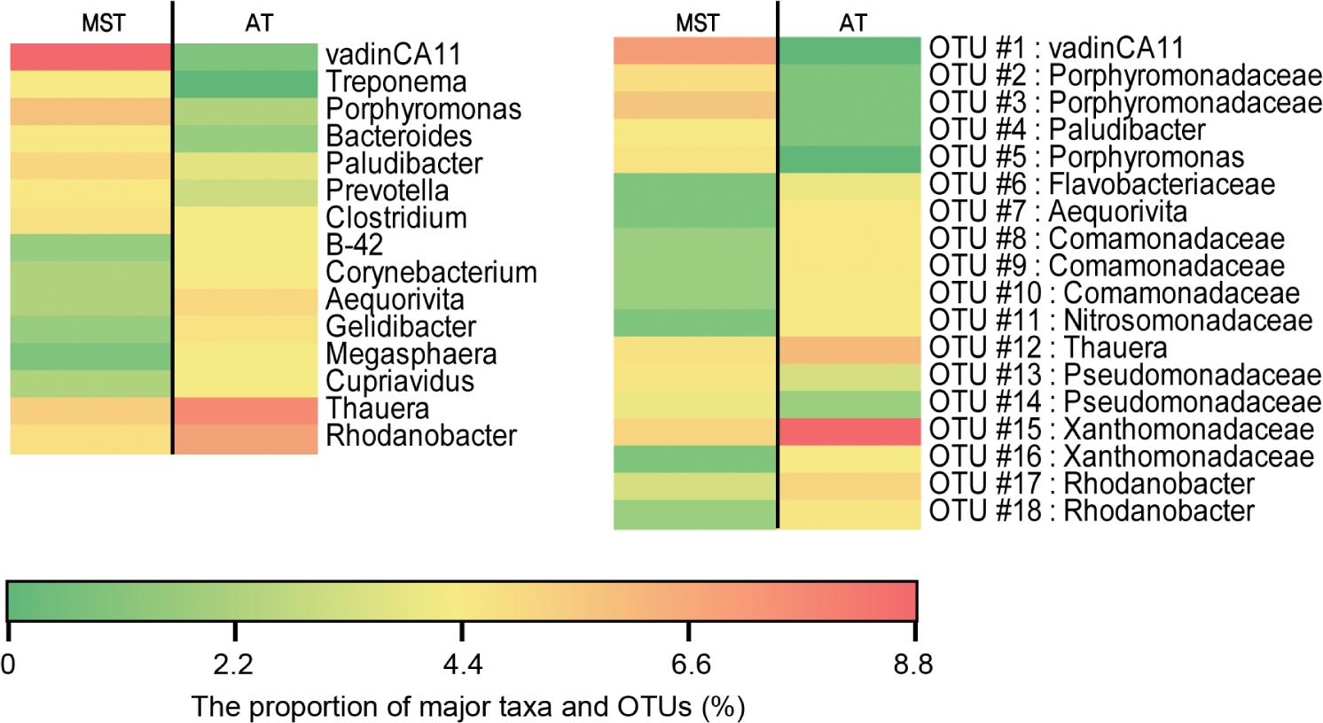 Heatmap showing the proportion of major taxa (a) and OTUs (b). Taxa and OTUs accounting for ≥ 0.5% of total sequence reads in at least 1 of the MST and the AT groups were regarded as “major” taxa and OTUs. MST, manure storage tank; AT, aeration tank