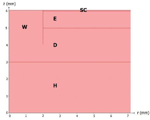 To be able to model a wound and the surrounding skin in a realistic yet calculable manner it is necessary to simplify the physical structure of skin as well as extend the simple semi-infinite capacitor model presented above. We therefore model the wound as rotationally symmetric around an axis perpendicular to the skin. The skin in turn is divided into four layers. In order they describe the stratum corneum (SC), the living epidermis (E), dermis (D) and hypodermis (H). The reason for this separation is that these layers have distinctly different dielectric properties as given in Table 1 [30]. The interfaces between the skin layers are taken as flat. This is an oversimplification. For example the interface between dermis and epidermis is corrugated as can be seen in a finger-print. However, we find that this simplification does not to any significant degree influence the electric field in and near to the wound. Furthermore, the field penetration in dermis and hypodermis is almost non-existing due to the high dielectric permittivities of these areas. Our model is implemented in the mathematical, finite element-using software Comsol Multiphysics