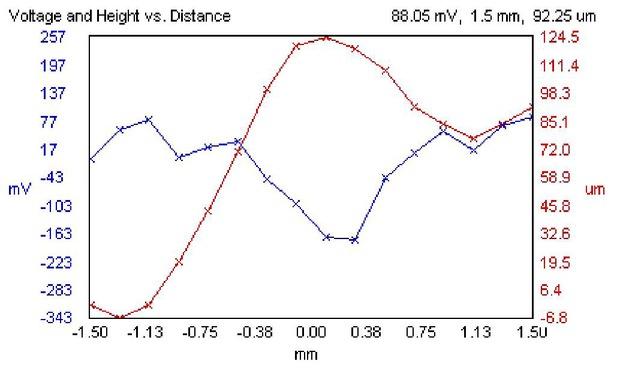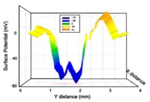 Experimental surface potential scanning across a human wound [14]. 0.0 mm corresponds to the middle part of the wound, where the potential has its minimum value. The curve that has a maximum at 0.0 mm (red) is the topographical profile of the wound (swelling makes it peak at wound center). The curve that has a minimum at 0.0 mm (blue) represents the measured potential. Probe size is 0.5 mm.