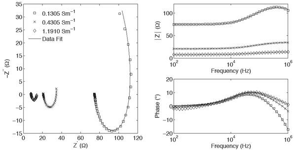 Fitting is performed on the impedance spectra of three known conductivity solutions. Artefact consistent with the existence of a parallel conductance is seen in each spectrum and is more pronounced for the lower conductivity solutions.