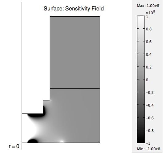 Since this model is axially symmetric, the pseudo geometric factor (or cell constant) can be calculated for the device by integrating over the full 3D volume. The sensitivity based pseudo geometric factor for the device is 13.3m-1. The numerical implementation of the measuring procedure gives a higher pseudo geometric factor of 16.0m-1.