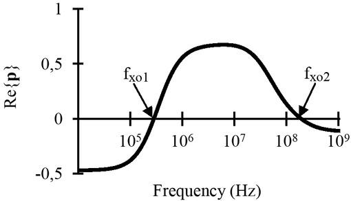Frequency variation of the real part of the Clausius-Mossotti function for lymphocytes, derived from published dielectric data [5]. The DEP force is proportional to this function and shows two cross-over frequencies, fxo1 and fxo2.