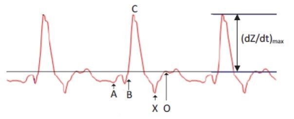 The typical ICG waveform and its characteristic points are shown in Figure 2. A, B, C, X and O are the main characteristic points of the ICG trace. These points are related to distinct physiological events in the cardiac cycle. The description of those points is presented in Table 1.