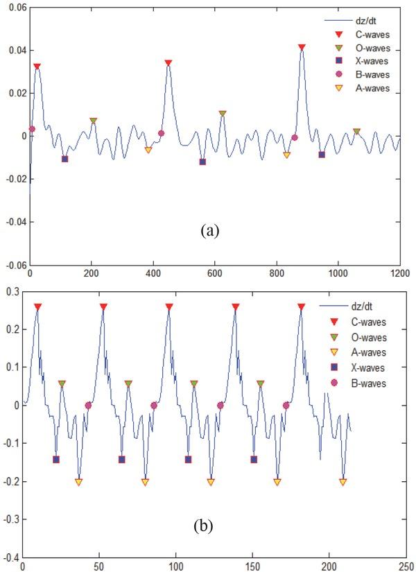 Impedance Cardiography traces recorded in (a) a control subject and (b) a patient with mitral insufficiency and the detection of the characteristic points (C-waves: red triangles, O-waves: green triangles, A-waves: yellow triangles, X-waves: blue squares, B-waves: pink circles).