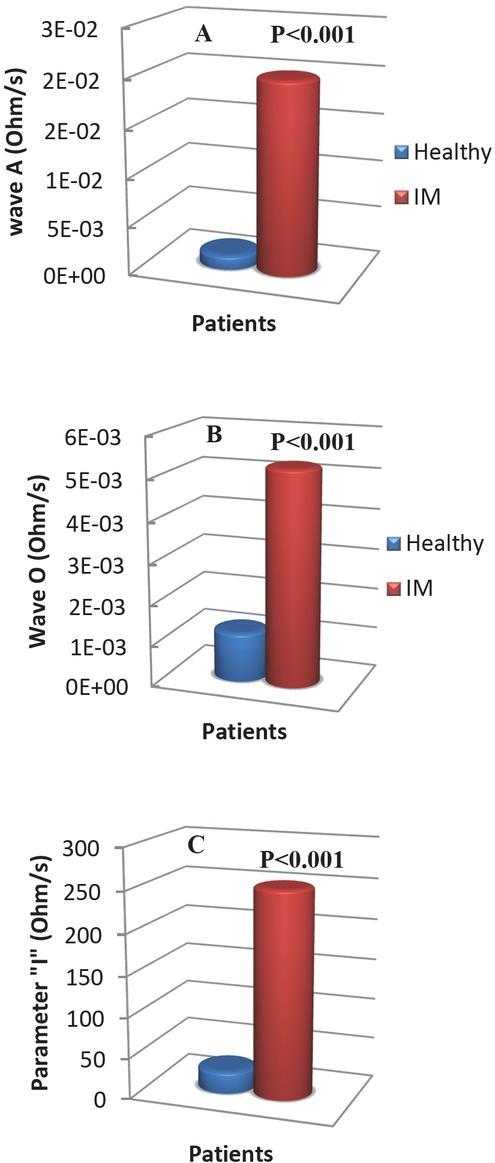 The O, A, and “I” mean values significantly increased, by a percentage of 77%, 92%, and 89%, respectively, in patients with MI compared to those in the control group (Figure 4). In particular, the diagnosis parameter “I” significantly increased in patients with MI compared to control subjects (2.7±1.5 Ohm/s vs 25.3 ± 0.4 Ohm/s).