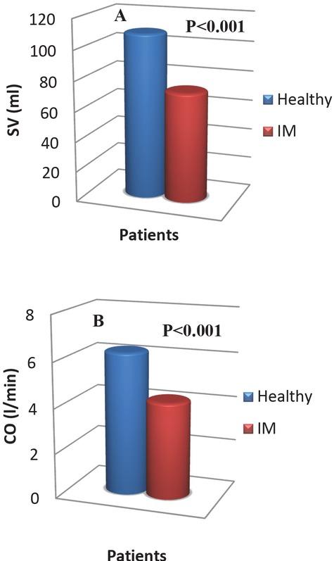 As a support for the obtained results, we calculated hemodynamic parameters for the two groups of subjects. The main hemodynamic parameters are the heart rate (HR), the left ventricular ejection time (LVET), the stroke volume (SV) and the cardiac output (CO). We found that, there were highly significant differences between the two groups of subjects in LVET, SV, and CO (p<0.001), but there was no significant difference between the mean heart rate values for control subjects and patients with MI (58±3 bpm vs 58±7 bpm) (Table 4). Figure 6 shows that the SV and CO significantly decreased on patient with MI compared to the control subjects.