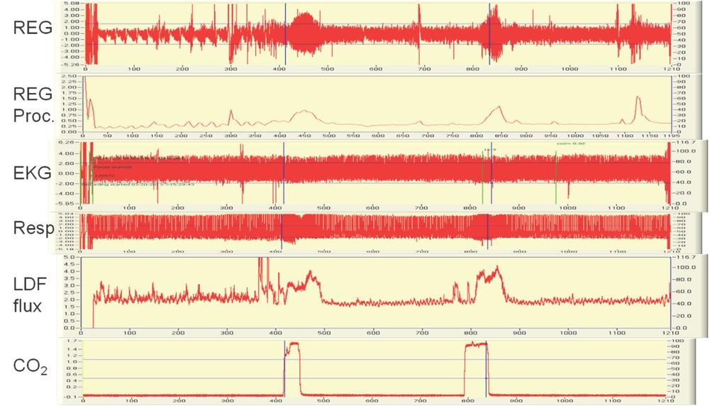 Impact of CO2 inhalation on LDF flux and REG signals, in real time: CO2 increases were followed by simultaneous increases in LDF flux and REG signal amplitudes. For all traces, Y axis is shown in volts; X axis is shown in seconds. Traces, from top, are REG raw signal; REG proc (processed signal, displayed as a running integral); EKG; Respiration (measured by bioimpedance); LDF flux; inhaled CO2.