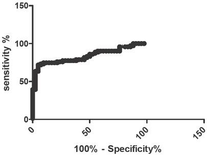 ROC curve of LDF and REG. Area under curve (AUC): 0.8394 with p<0.0001; Std. error: 0.03693; 95 % confidence interval: 0.7670 to 0.9118. Figure and numbers are presented as Prism program shown and calculated from the percent values of REG and LDF signals.