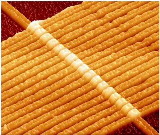 The first realized memristor, produced in the HP lab. Seventeen nano-memristors are shown in parallel. (This image was produced by R. Stanley Williams of the HP lab and it is reproduced with permission from R. Stanley Williams.)