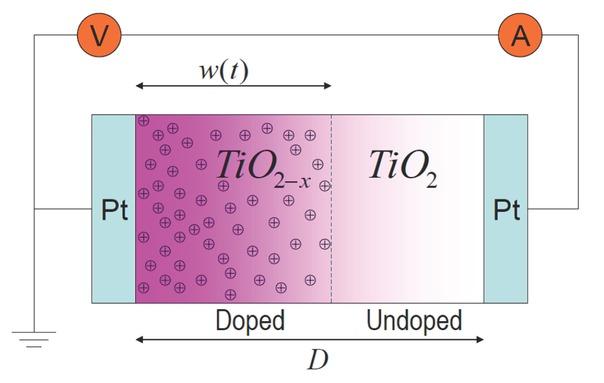 Cross-section of the first HP TiO2-memristor consisting of a high conductive (doped) and a low conductive (undoped) part placed in between two platinum electrodes. The boundary between the two parts is dynamic and is moved back and forth by the passing charge carriers. The parameter w(t) is a mathematic variable that describes the position of this boundary [4]. Courtesy of C. Lütken.