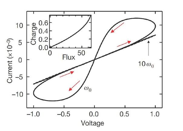 Typical behavior of memristors. The memristance of the memristor depends on the amount of electric charge that has passed through the device. Consequently, the current is nonlinear with the applied voltage, resulting in hysteresis loops rather than straight lines. If the signal frequency, ω, is sufficiently high, the memristance of the memristor has too little time to respond to the passing charge, resulting in the collapse of the hysteresis loops to straight lines. The inset figure shows that memristors require nonlinear q-φ-plots. Reprinted from Nature with permission [2].
