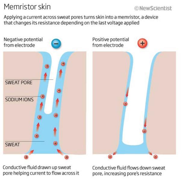Skin conductance measurements performed at low frequencies have revealed that the missing memristor has been at our nose tip the whole time. Our skin behaves as a memristor due to the dominance of the sweat ducts on the skin conductance at sufficiently low frequencies [9,20]. An illustration of such a sweat duct, partly filled with liquid, is shown in Figure 7. When a low-frequency signal is applied to the skin and its many sweat ducts, the degree of liquid filling will depend on the amount of charge that passes through the ducts. When a negative voltage signal is applied the liquid level rises through the electro-osmosis process [20]. As the duct becomes more filled with sweat liquid, the conductance increases since sweat conducts current very well [21, 22, 23]. If the polarity of the signal is positive, the liquid level is driven downwards in the duct, resulting in a decrease of the overall skin conductance. So when measuring skin conductance at low frequencies, we observe that it changes dynamically with time when current is passing through the skin. The actual dependence is based on how much charge has passed through the duct since each charge carrier pushes the liquid along with its motion by electro-osmotic forces. It turns out each of us are all wrapped up in a biological memristor.
