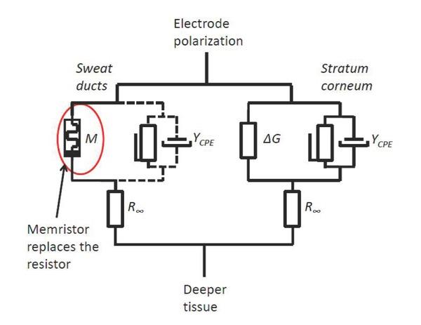 The equivalent electrical model of the human skin may therefore involve the memristor as suggested in Figure 8 when doing impedance measurements. The new thing in this manner is that the traditional resistor for sweat conductance is substituted with the memristor, as highlighted in red in Figure 8.