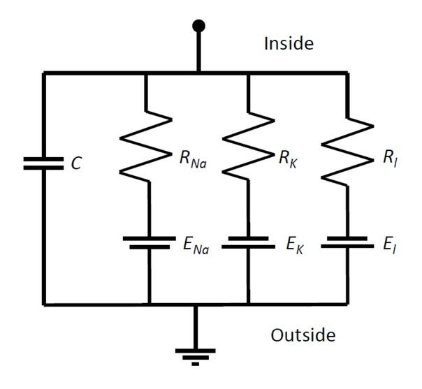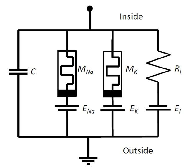 The equivalent circuit of the Hodgkin-Huxley model is shown in Figure 9. The model describes charge transport across a nerve cell membrane by introducing specific channels for potassium and sodium ions, a leakage channel, a capacitor describing the properties of the membrane itself. For more rigorous introductions to the Hodgkin-Huxley theory we recommend consulting Johnston & Wu (1994) and Dayan & Abbott (2001) [26,27].