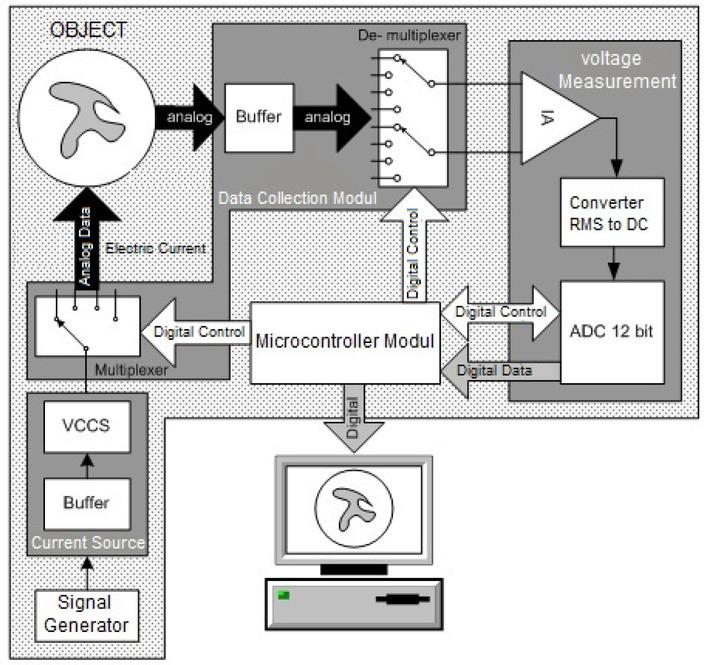 Electrical Impedance Tomography (EIT) is a technique used to obtain conductivity distribution by injecting current and measuring voltage on the surface of the object. EIT has many advantages, include portability, real time acquisition, non-invasiveness, and low cost and it generates a functional image (Yaqin, 2010). However, the disadvantage of EIT is the low-resolution image. To improve imaging resolution, it has been developed by combining the two modalities between electrical conductivity techniques that have high contrast and magnetic fields or ultrasound imaging techniques that have a high resolution. Several techniques that have been conducted are magnetic resonance electrical impedance tomography (MR-EIT), magnetoacoustics, electroacoustics, acoustoelectrics, and electrical impedance ultrasound reflection tomography (EIT-URT).