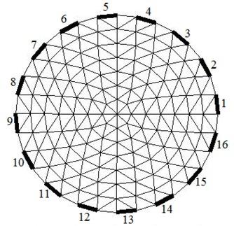 The uniform element model with 141 nodes, 248 elements and 16 electrodes channels