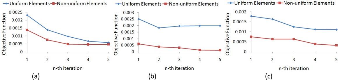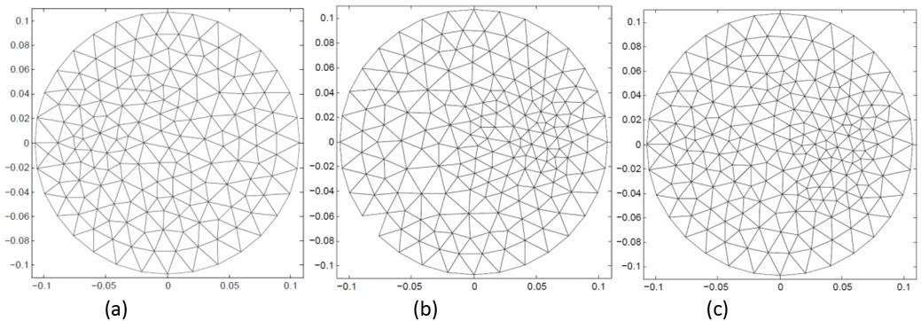 Non-uniform element model with (a) 166 nodes and 298 elements, (b) 179 nodes and 324 elements, and (c) 201 nodes and 368 elements